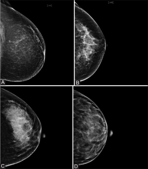 Breast density is graded from 1-4, indicating the amount of fibroglandular tissue in the breast.