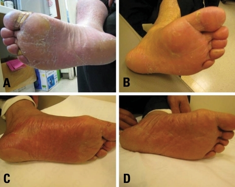 Skin changes (e.g. peeling, blisters, bleeding, oedema, or hyperkeratosis) with pain; limiting self-care activities of daily living (ADLs) |