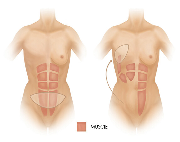 This procedure transfers skin, fat and part of the vertical abdominal muscle to the breast under the abdomen. Abdominal skin is used to fill in the defect on the central part of the breast, while the remaining tissue creates breast volume. The abdomen is flatter after tissue removal, and the navel is repositioned, resulting in a ‘tummy tuck’.